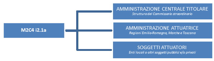 In completa analogia al percorso già attuato e risultato particolarmente efficiente nel sub investimento 2.1b della medesima misura PNRR di titolarità del Dipartimento della Protezione Civile della Presidenza del Consiglio dei Ministri, al fine di ottimizzare i flussi di monitoraggio e rendicontazione della Misura M2C4 I2.1a, si è provveduto ad aggiornare il sistema di governance, passando dal modello iniziale che prevedeva un rapporto diretto Commissario-Soggetti Attuatori ad una struttura su tre livelli, prevedendo il coinvolgimento delle Regioni (Emilia-Romagna, Toscana, Marche), già operanti tramite i Presidenti in qualità di Sub-Commissari, in qualità di Amministrazioni Attuatrici intermedie.
