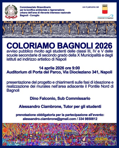 Un’iniziativa di arte pubblica partecipata per coinvolgere le giovani generazioni nel processo di rigenerazione urbana del SIN Bagnoli-CoroglioNell’ambito delle attività di valorizzazione e apertura alla cittadinanza del comprensorio di Bagnoli-Coroglio, il Commissariato Straordinario per la bonifica ambientale e la rigenerazione urbana promuove l’iniziativa “Coloriamo Bagnoli 2026”, un progetto rivolto agli studenti delle classi terze, quarte e quinte delle scuole secondarie di secondo grado della X Municipalità e degli istituti ad indirizzo artistico della città di Napoli.