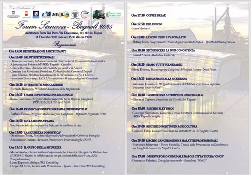🔹 Nell’ambito del calendario di eventi ospitati presso l’Auditorium “La Porta del Parco”, l’11 dicembre 2025 si tiene il Forum Sicurezza – Bagnoli 2025, un’iniziativa rivolta alla cittadinanza, alle scuole, agli operatori del settore e ai rappresentanti istituzionali, dedicata alla diffusione della cultura della prevenzione e alla valorizzazione della sicurezza nei diversi ambiti della vita quotidiana e lavorativa.