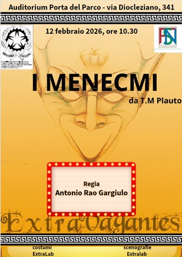 Il 12 febbraio 2026, alle ore 10.30, la celebre commedia plautina in scena con la regia di Antonio Rao GargiuloL’Auditorium Porta del Parco, in via Diocleziano 341 a Napoli, accoglierà giovedì 12 febbraio 2026 alle ore 10.30 la rappresentazione teatrale de I Menecmi di Tito Maccio Plauto, uno dei testi più noti e rappresentativi della commedia latina.