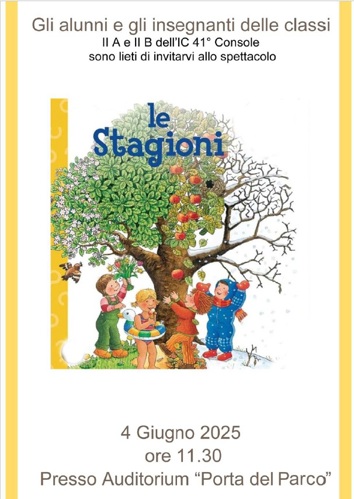 Un viaggio tra i colori, i suoni e le emozioni delle stagioni: è questo il filo conduttore dello spettacolo messo in scena dagli alunni delle classi II A e II B dell’I.C. 41° Console, che animeranno il palco dell’Auditorium con coreografie, musiche e testi ispirati al ciclo della natura.