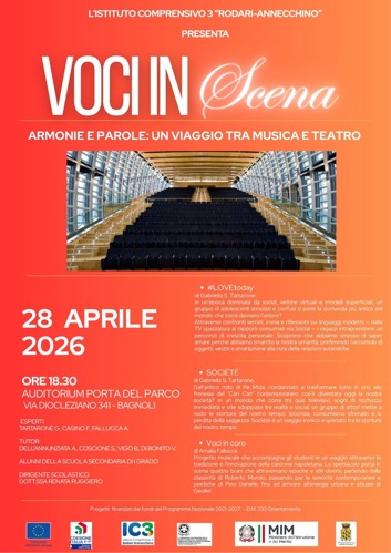 Martedì 28 aprile 2026, alle ore 18.30, l’Auditorium “La Porta del Parco” ospiterà lo spettacolo “Voci in scena – Armonie e parole: un viaggio tra musica e teatro”, iniziativa promossa dall’Istituto Comprensivo 3 “Rodari–Annecchino” e realizzata con la partecipazione degli studenti della scuola secondaria di primo grado.