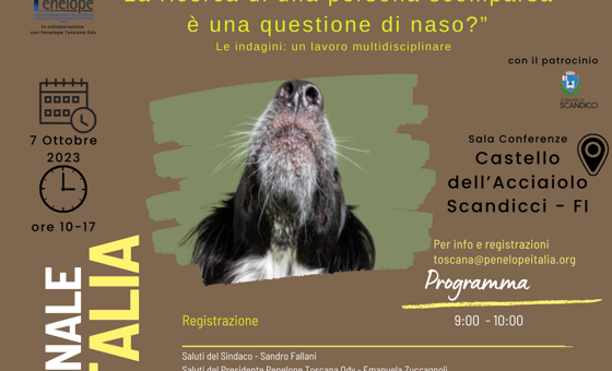 Il giorno 7 ottobre 2023, presso il Castello dell’Acciaiolo di Scandicci (FI), si è svolto il convengo “La ricerca di una persona scomparsa è una questione di naso” organizzato da Penelope Italia, a cui è intervento il Commissario straordinario del Governo per le persone scomparse.